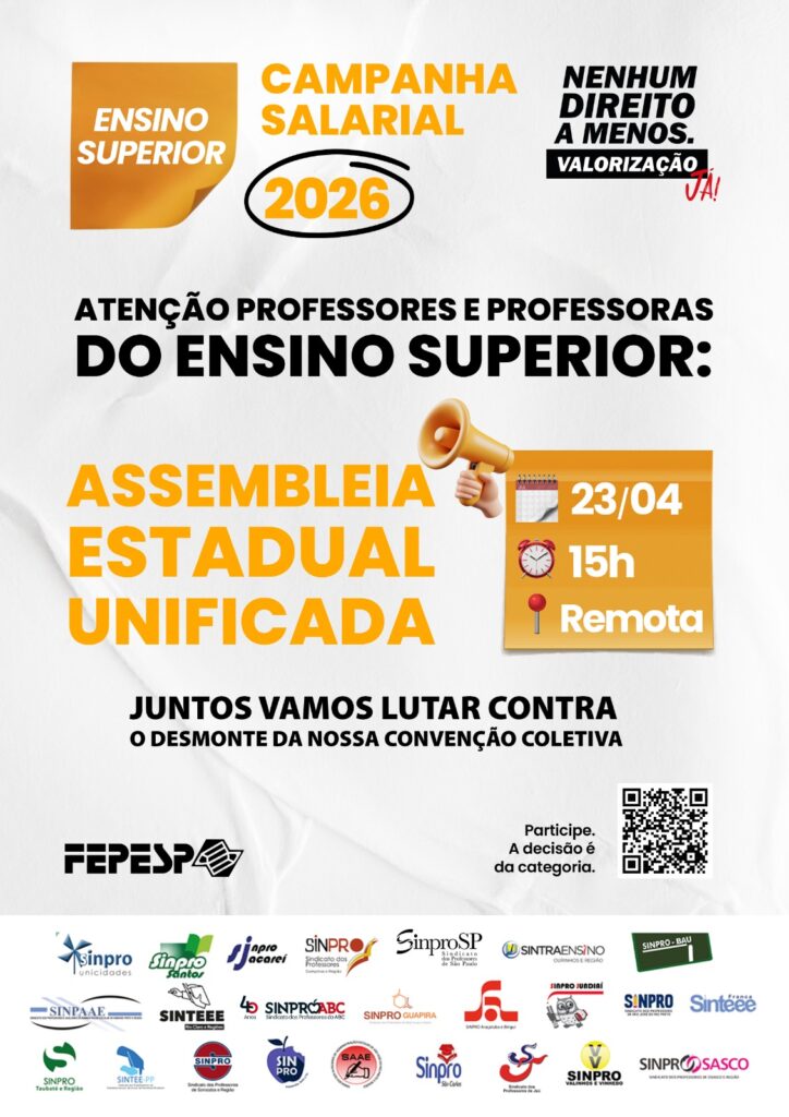 Professoras e professores do ensino superior de todo o estado estão convocados para a Assembleia Estadual Unificada.