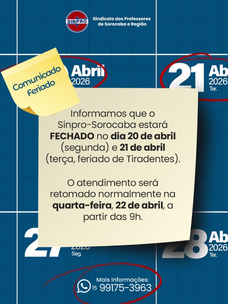 Informamos que o Sinpro-Sorocaba estará fechado no dia 20 de abril (segunda) e 21 de abril (terça, feriado de Tiradentes).