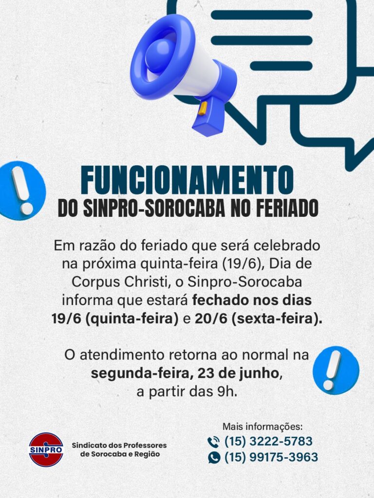 Em razão do feriado que será celebrado na próxima quinta-feira (19/6), Dia de Corpus Christi, o Sinpro-Sorocaba informa que estará fechado nos dias 19/6 (quinta-feira) e 20/6 (sexta-feira).