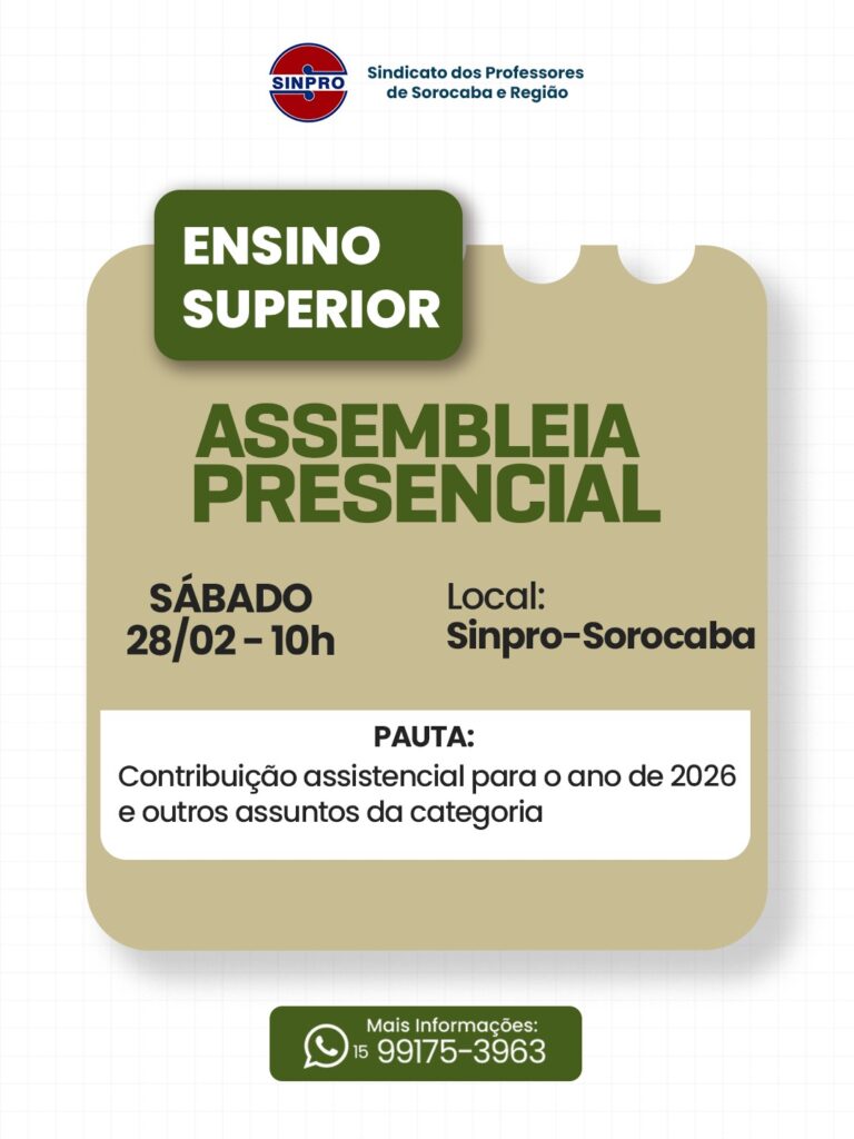 O Sinpro-Sorocaba convoca todas as professoras e todos os professores do ensino superior, para uma Assembleia Geral Extraordinária que será realizada no próximo sábado (28), com primeira chamada às 9h30 e segunda chamada às 10h, na sede do sindicato.