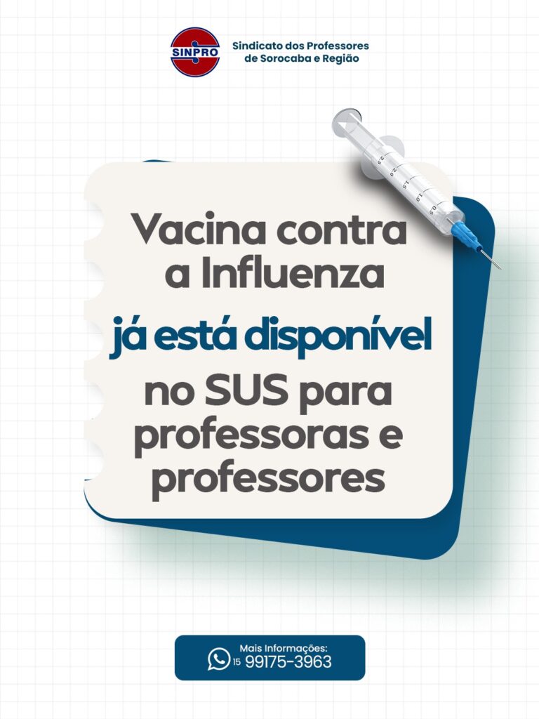 O Ministério da Saúde já iniciou a campanha de vacinação contra a influenza no Município de Sorocaba. Para o grupo prioritário, do qual professoras e professores da educação básica ao ensino superior fazem parte, a vacina está disponível nas 33 Unidades Básicas de Saúde (UBSs) da cidade, das 8h às 17h, de segunda a sexta-feira.
